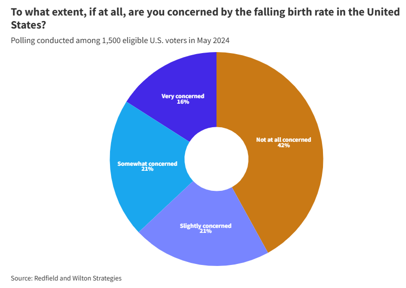 Another poll, by Newsweek in 2024, asked: “Are you concerned by the falling birth rate in the United States?” People were told that birthrates were falling and still, 42% responded that they were ‘not at all concerned’ while just 16% said they were ‘very concerned.’