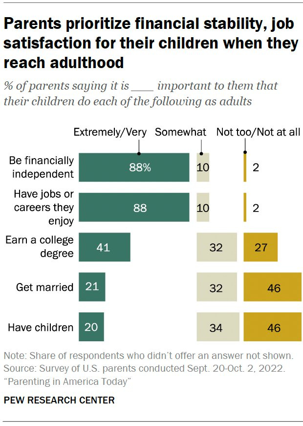 If these priorities seem off, consider what parents of young adults are saying. A 2022 poll also by Pew found that 88% of parents said it is at least somewhat important that their children find a job or career they enjoy while only 20% of parents said it is at least somewhat important that their children have families of their own one day. By contrast some 46% of parents said it is unimportant if their own children have a family.