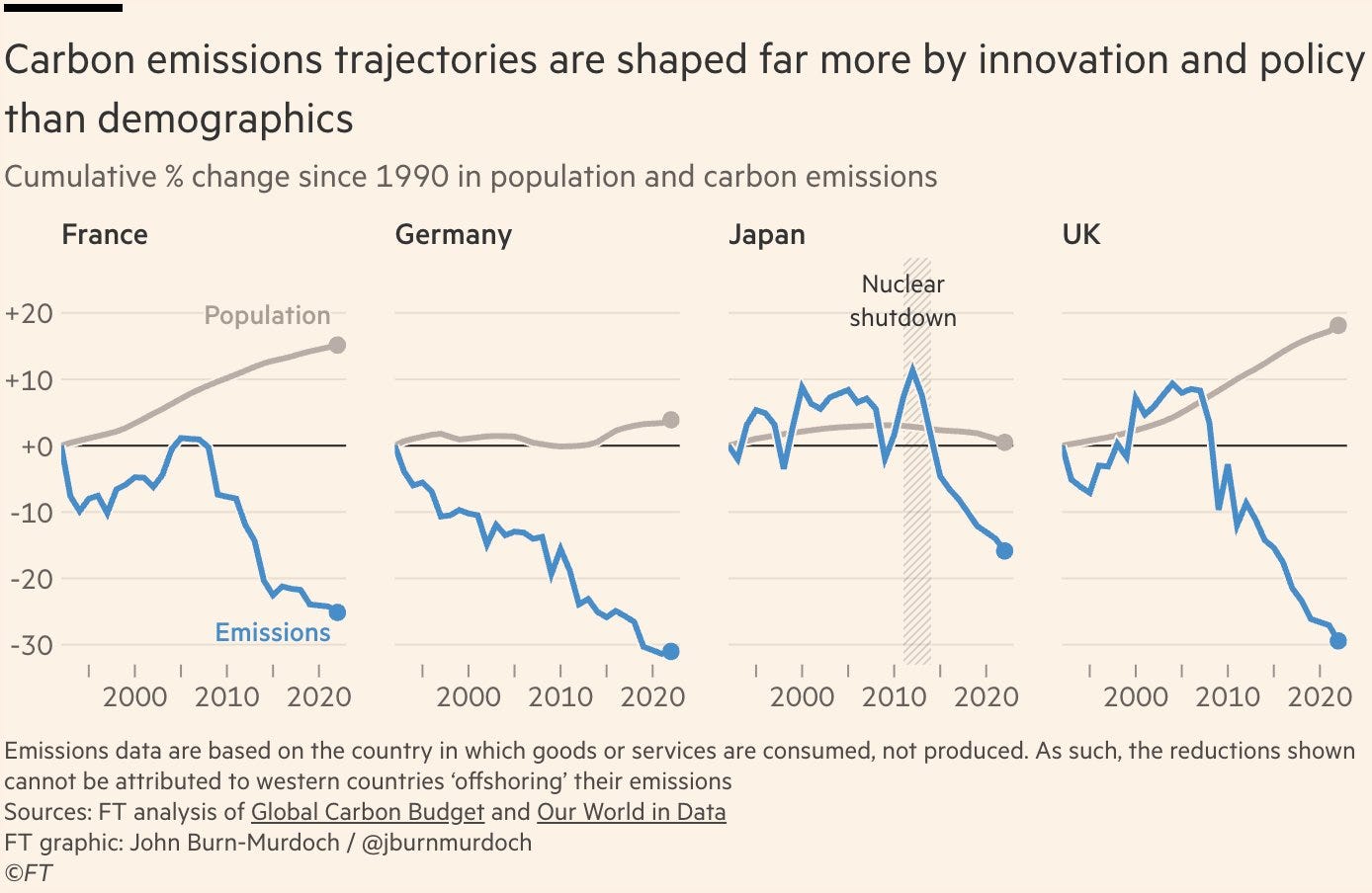 What about environmental degradation? Just last month, data analyst John Burn-Murdoch showed that environmental metrics are getting better, not worse, because of innovation (which comes from of large, educated populations).