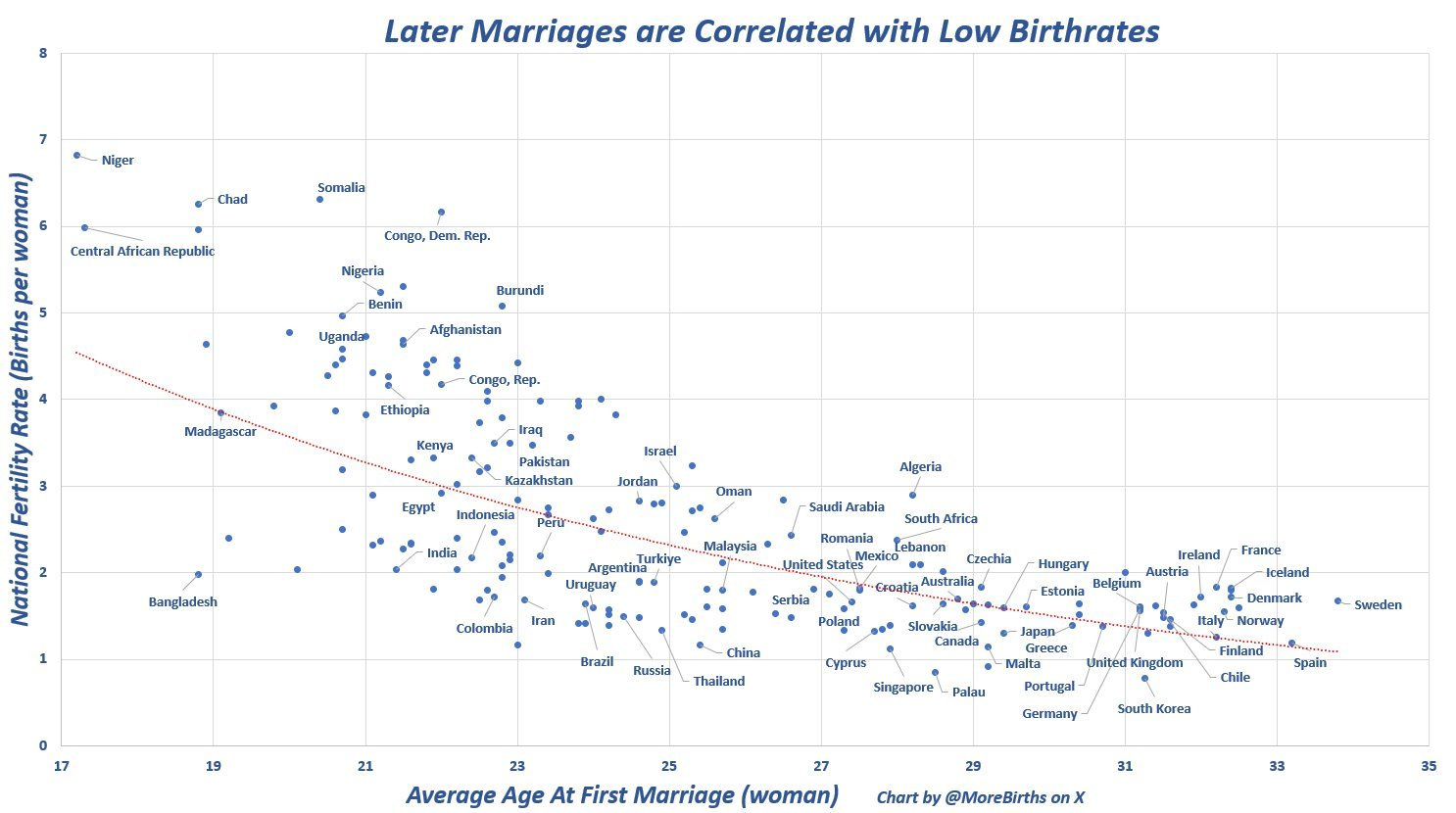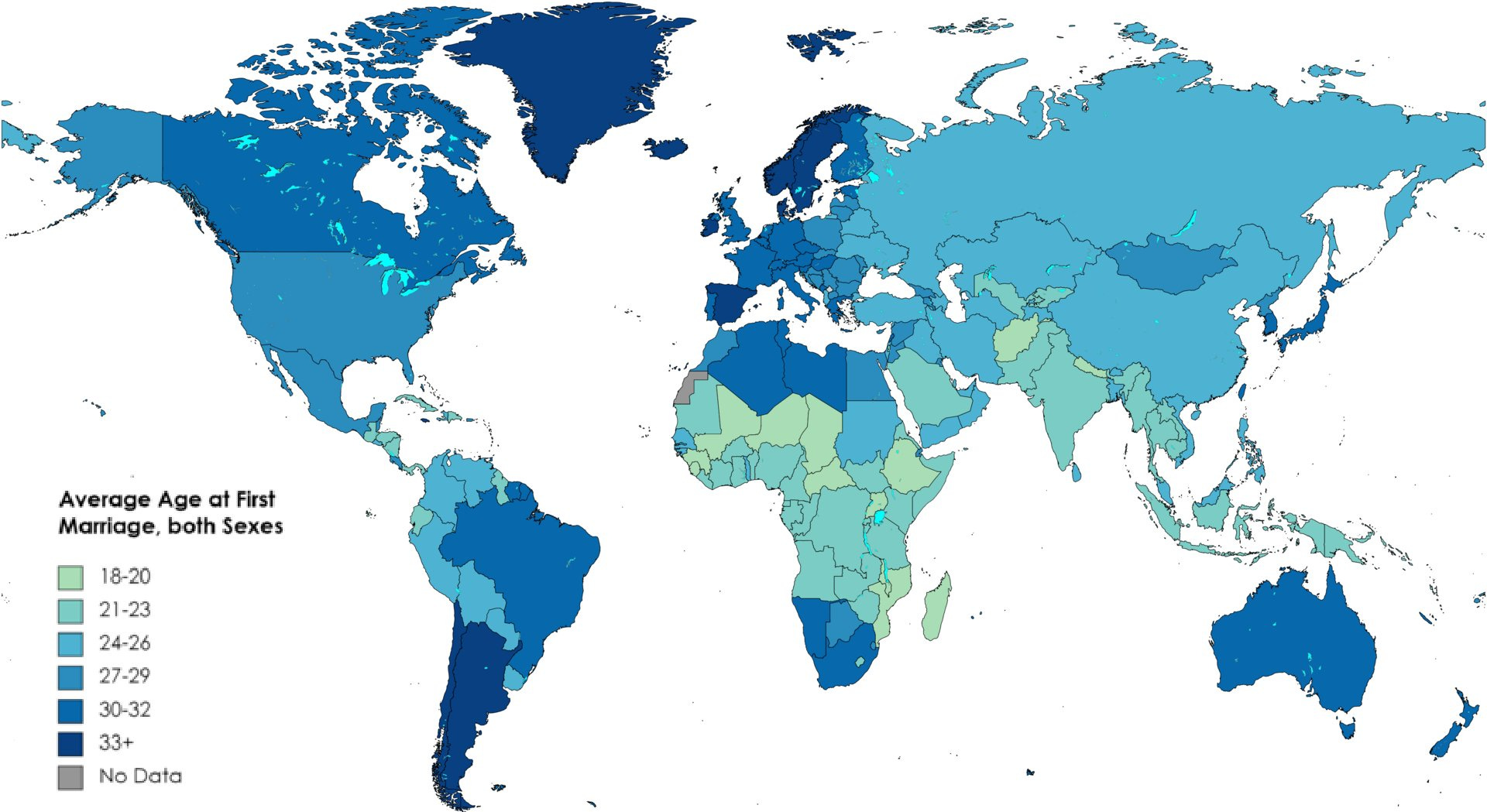 If you noticed that this map of the average age of marriage looks a lot like a global fertility map, that is no coincidence. Countries where marriage comes late as in Europe, Canada, East Asia and much of South America, almost invariably have very low birthrates.