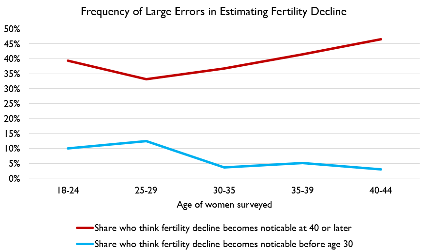 Although fertility drops throughout the 20s, just ten percent of women were aware of that. Nearly half of women thought that fertility decline only becomes noticeable after age 40, but by then fertility is almost gone.