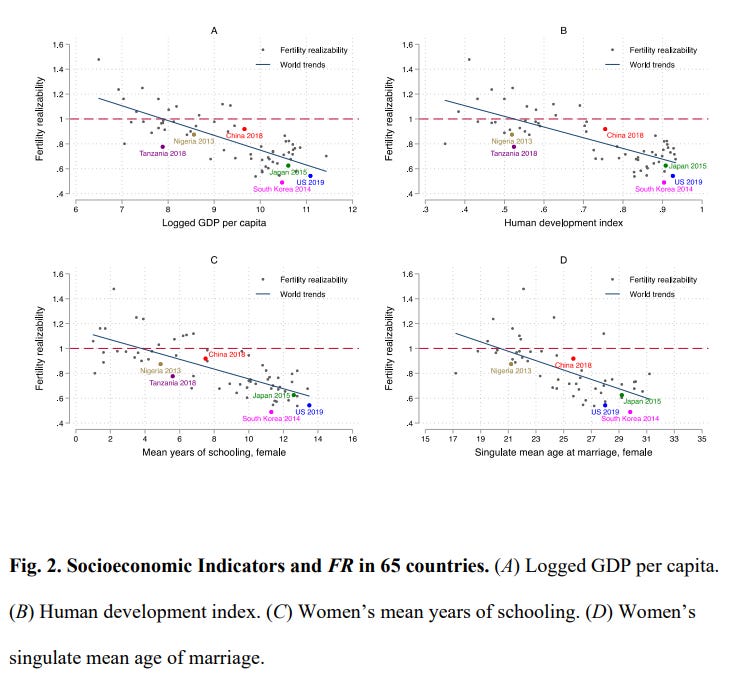 As countries get richer, as the human development index increased, as years of schooling rose and as marriage age rose, people were much less likely to realize their fertility goals.