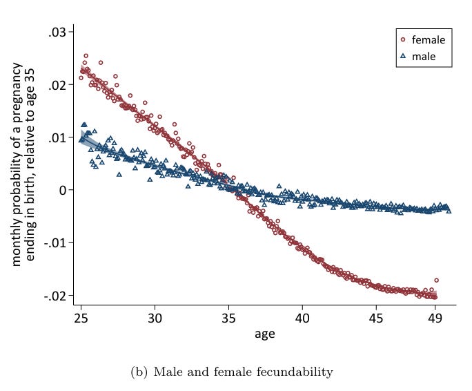 And by the way, age limits the fertility of men almost as much as women. The overwhelming majority of men are partnered with women similar in age to themselves, so the odds fatherhood drop off almost as steeply as the odds of motherhood.