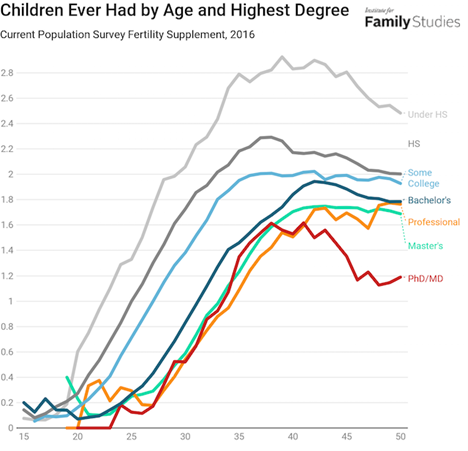 One of the most robust findings in demography, both in the United States and around the world, is that more education means lower fertility. Among women who had finished having children in 2016, the difference in the number of children between the most and least educated women was 1.2.