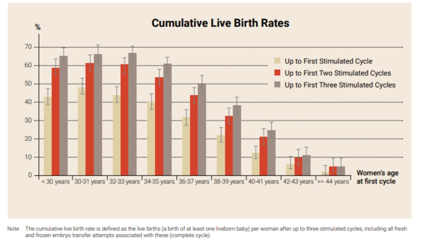 But the success of IVF drops off with age exactly like women’s fertility generally and a woman aged 44 has less than a 5% change of live birth after three simulated cycles.