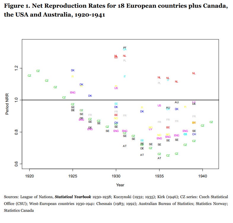 The chart below is from the paper “Subreplacement Fertility in the West before the Baby Boom” by Jan Van Bevel. It uses Net Reproduction Rate (NRR) which is the number of surviving daughters born per woman, so a figure less than 1 is below replacement.