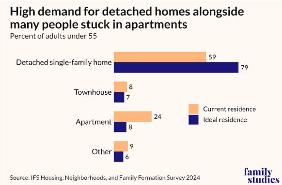 There are some problems with this ideal. First of all, it’s not what people want. The Institute for Family Studies surveyed almost 9000 Americans to find out what sort of housing Americans prefer. Some 79 percent said that their ideal residence is a single-family home while just 8 percent said they prefer an apartment.