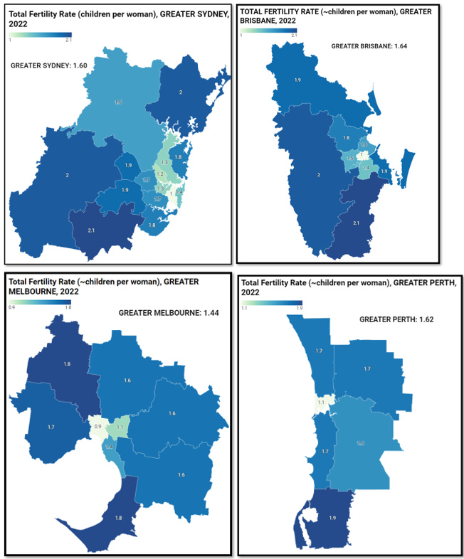 In Sydney, Brisbane, Melbourne and Perth, the fertility rate ranges from 1.6 to 2.1 in the suburbs of single-family homes and just 0.9 to 1.1 in the apartment block-based urban core. That is up to a 100% fertility difference based on housing type and neighborhood alone. In demography, that is an absolutely enormous effect. If some pronatal policy increased TFR by just 0.1, many would consider it a win.