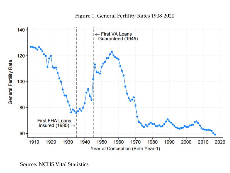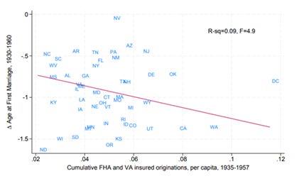 This makes perfect sense. When people were able to get a home sooner, they could marry sooner, boosting fertility. And the paper presents evidence that more FHA and VA mortgage originations per capita were associated with earlier marriages.