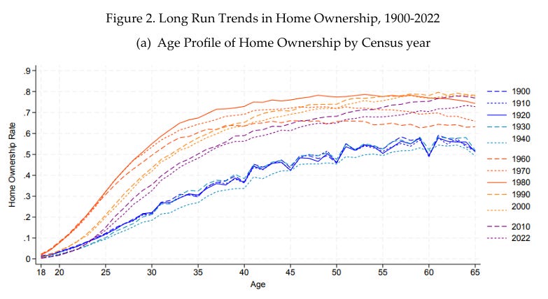 We can see the massive change in homeownership by age. Before the modern mortgage, most people in their childbearing years were not homeowners. Just 20% of 30-year-olds owned a home. After the modern mortgage, 55% of 30-year-olds were homeowners. Marriage and childbearing soared.