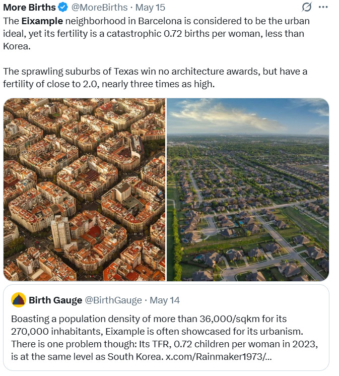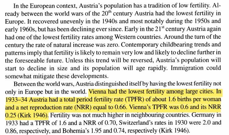 Then, as now, the low birthrate crisis was most acute in cities, which were seen as inhospitable to children. In fact, in the crowded European capital of Vienna, fertility fell to one quarter of replacement, even lower than in Seoul in 2025!